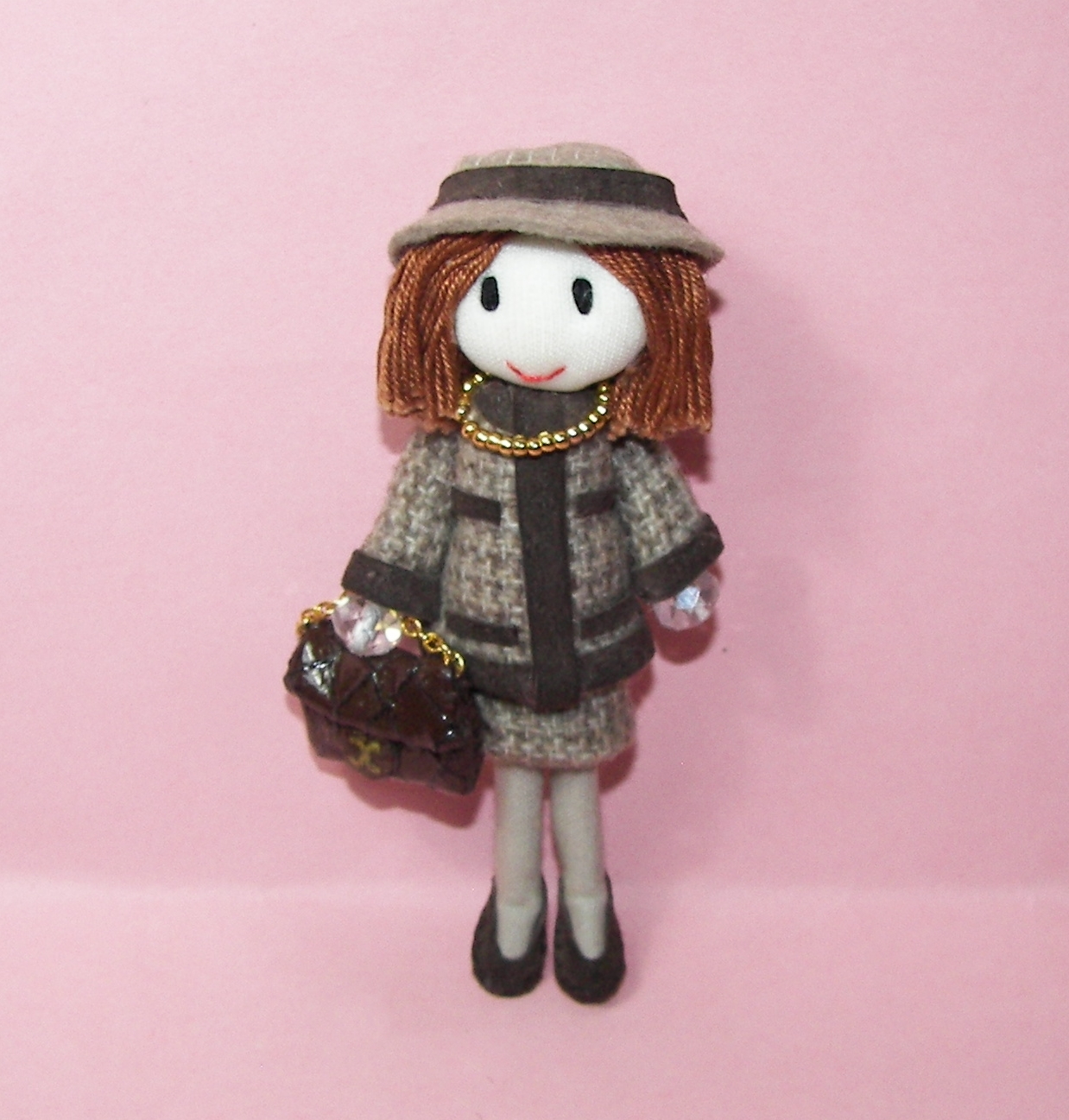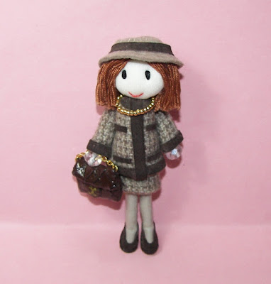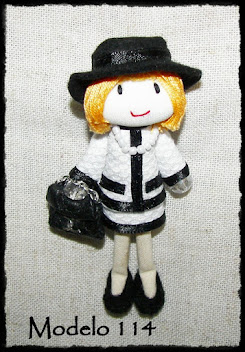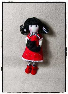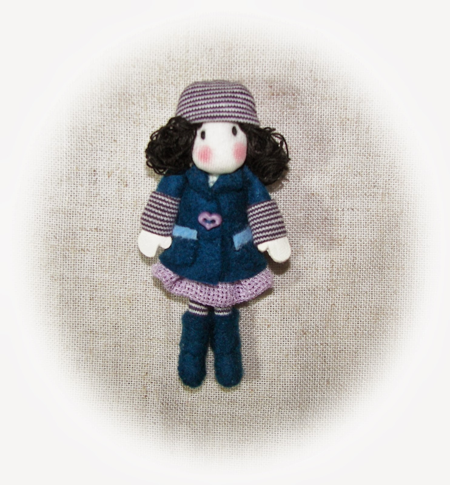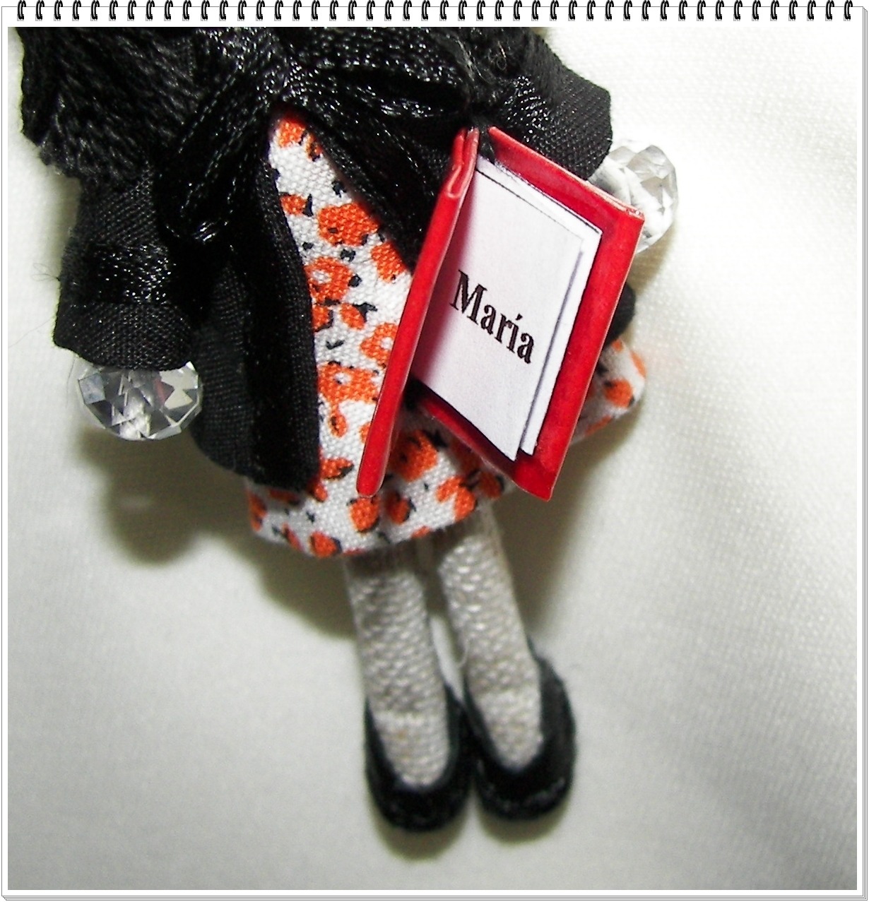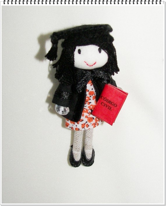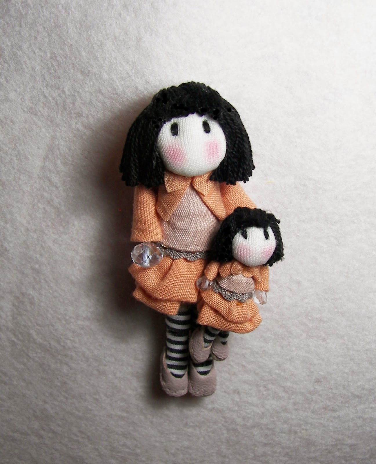 Este nuevo broche consta de una Gorjuss de 9 cm con otra muñequita Gorjuss de 4 cm. Van vestidas igual.