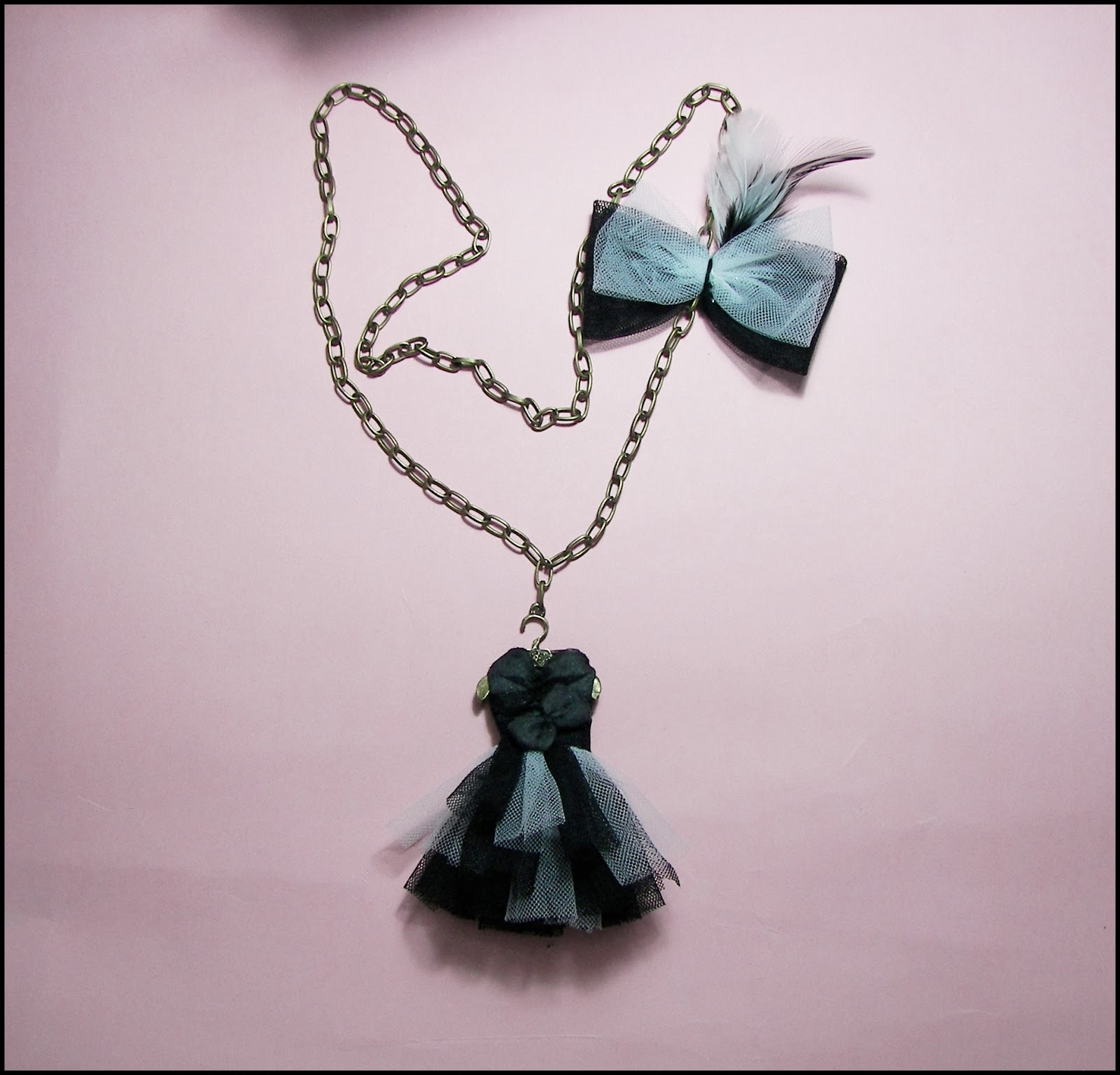 Collares de vestiditos en perchas de miniatura. Los vestidos también pueden ser broches o marcapáginas.